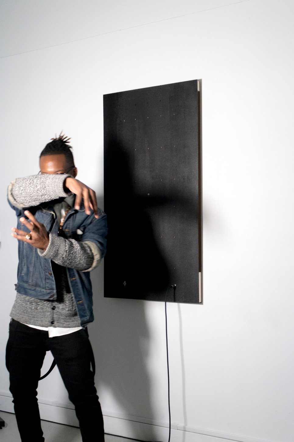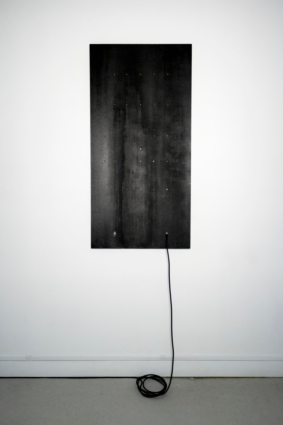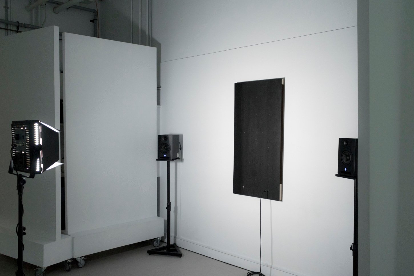 Sound Mirror (No.1) is an interactive installation and an instrument. It produces varying sounds based on an individual’s presence, movement, and proximity to the panel. It acts as an interface for an intimate self-examination and sonically mirrors an individual’s presence. There are two main electronic sensors on the panel; a movement sensor activates the sound when a presence has been detected, and an array of photocells senses the amount of light from the spotlight. The disruption caused by a body interrupting the light source to the photocells is translated into the tones and pitch of Sound Mirror: the less light that the photocells detect, a slower and deeper sound is produced.